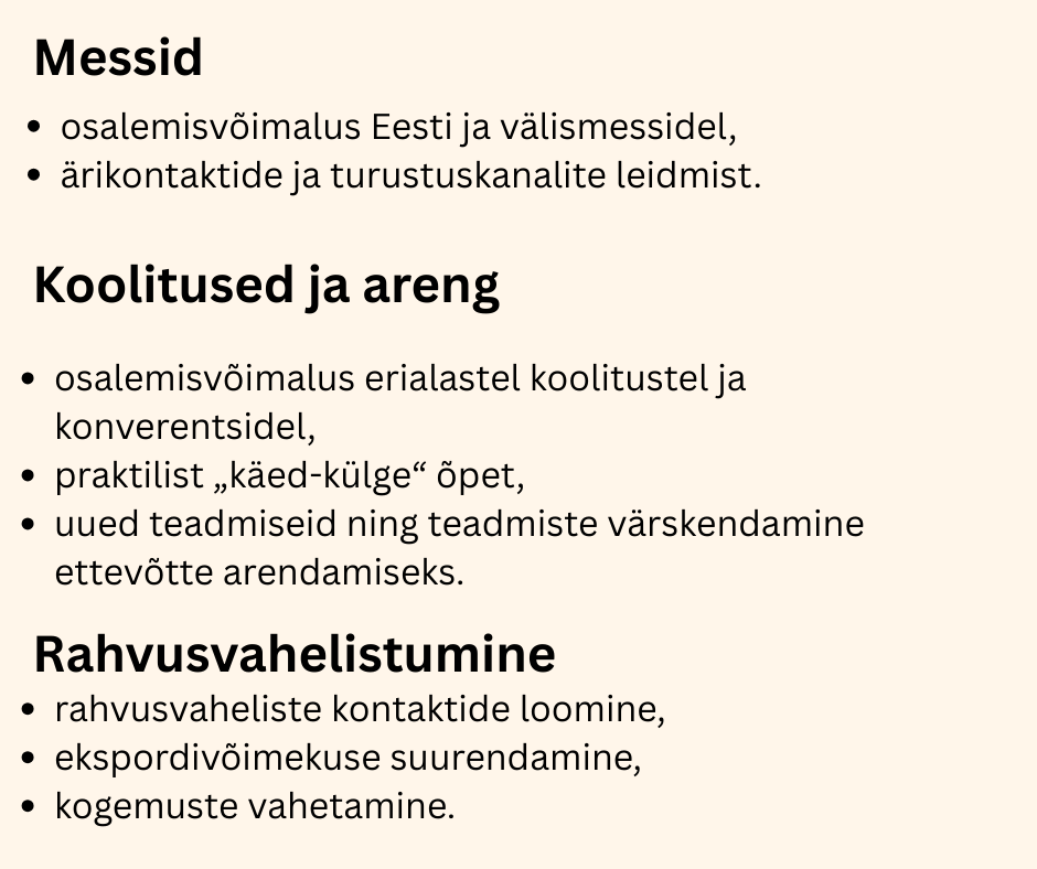 - leida kliente ja koostööpartnereid või õppida/kinnistada oma teadmiseid oma valdkonna parimatelt — kodus ja maailmas