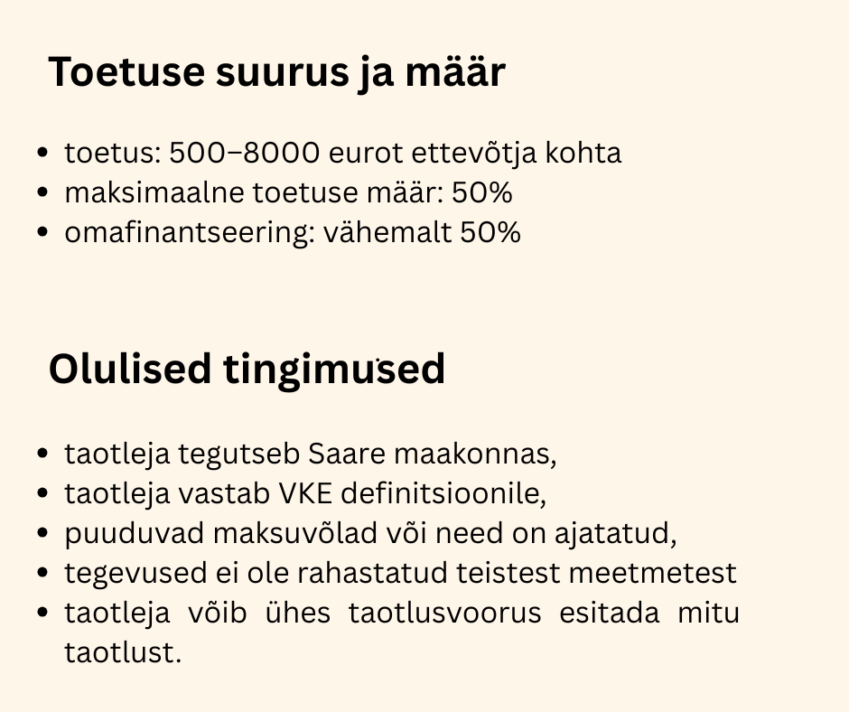 | 2026/ I taotlusvoor | 19.01.2026 - 30.01.2026 | Saare maakonnas tegutsev ettevõtja | 01.03.2026 - 31.12.2026 |