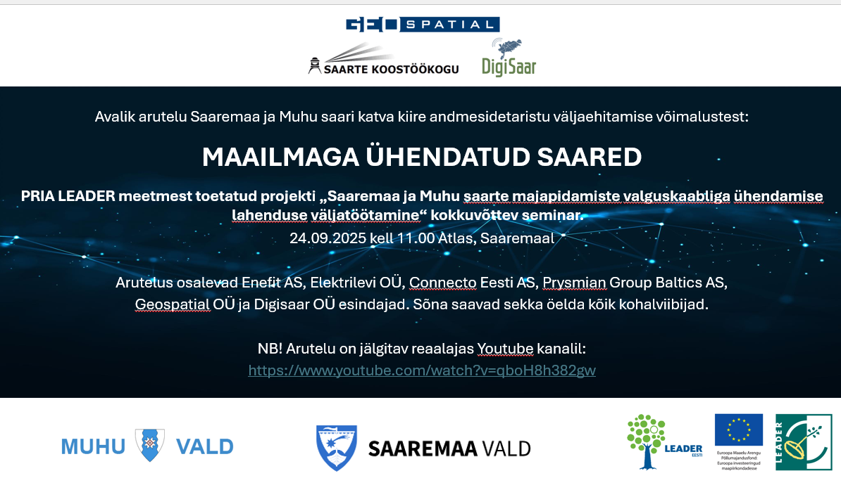 PRIA LEADER meetmest toetatud projekti „Saaremaa ja Muhu saarte majapidamiste valguskaabliga ühendamise lahenduse väljatöötamine“ kokkuvõttev seminar MAAILMAGA ÜHENDATUD SAARED.