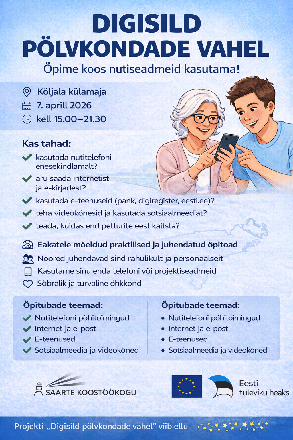 Jätkub projekt „Digisild põlvkondade vahel“ ühendab Saaremaa noored ja eakad ühise eesmärgi nimel – õppida koos toime tulema üha digitaalsemas maailmas. Koolinoored tegutsevad vabatahtlike juhendajatena, aidates eakaid praktilistes töötubades omandada oskusi nutitelefoni, interneti ja e-teenuste turvaliseks kasutamiseks.