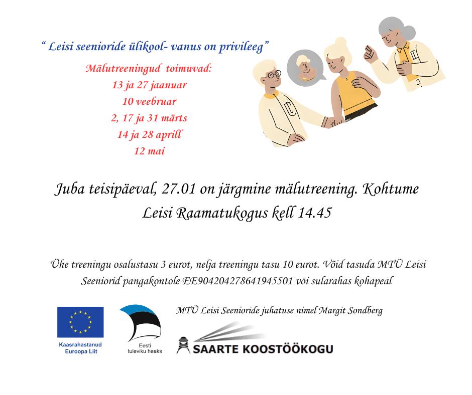 “Leisi Seenioride Ülikool on algatus, mille eesmärk on pakkuda eakatele uusi teadmisi, oskusi ja aktiivseid tegevusi, et parandada igapäevast toimetulekut ja rikastada elu. Projekti raames toimuvad mälutreeningu töötoad, arvuti algõppe ja digiturvalisuse koolitused, aktiivpäev Hiievälja talus koos kriisivalmiduse loenguga ning tänuüritusena reis Hiiumaale. Need tegevused aitavad vähendada sotsiaalset isolatsiooni, suurendada turvalisust ja tervislikku aktiivsust ning luua uusi sõprussidemeid.”